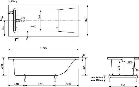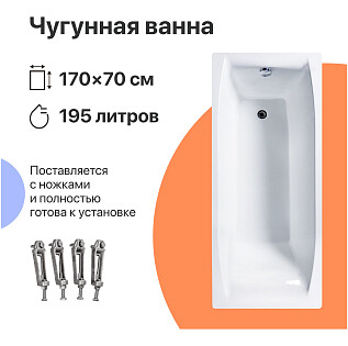 Ванна чугунная 170x70 см белая Diwo "Анапа" DA0004, D0017