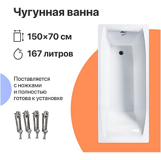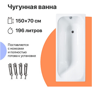 Ванна чугунная 150х70 см белая Diwo "Кострома" DK0006, D0017
