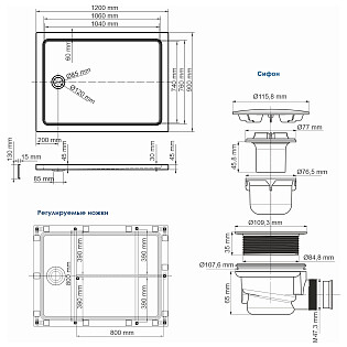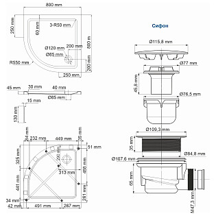 Поддон для душа акриловый четверть круга с монтажной рамой и экраном 90х90 см белый Diwo R 45-90