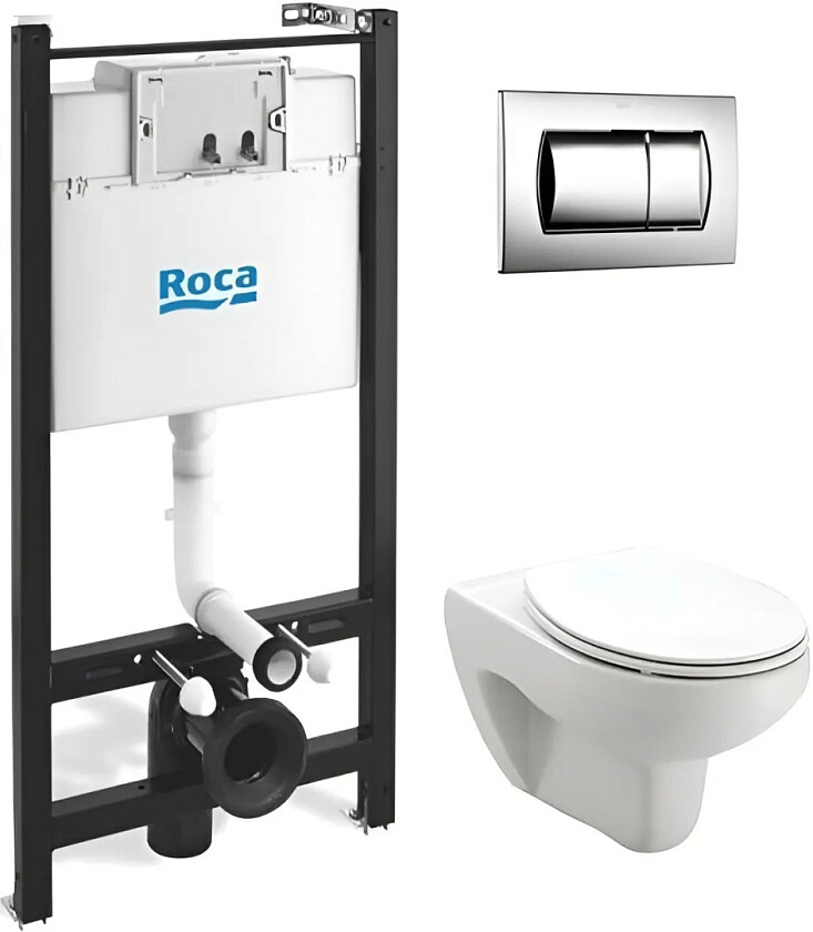 Готовое решение от испанского производителя Roca для санузла в современном стиле — в комплекте инсталляция для унитаза со встроенным смывным бачком, подвесной унитаз, сиденье с микролифтом, смывная клавиша, крепёжный набор. Комплект полностью готов для монтажа и облицовки.