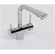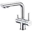 Смеситель с возможностью подключения любого стандартного фильтра для очистки воды. Регулировка подачи очищенной питьевой воды осуществляется с помощью поворота ручки смесителя. Смесители под фильтр подают как обычную водопроводную, так и питьевую воду. С помощью поворота правой ручки смесителя вы регулируете подачу водопроводной воды и ее температуру. При этом поток воды поступает из одного отверстия на изливе смесителя. Чтобы включить подачу очищенной питьевой воды из другого отверстия на изливе смесителя, необходимо повернуть левую ручку изделия. При этом ручка регулирования подачи водопроводной воды должна находиться в закрытом состоянии. Это необходимо для удобного использования питьевой воды. Подача водопроводной и питьевой воды подключаются независимо друг от друга, то есть поток воды может одновременно поступать из двух отверстий смесителя.