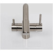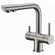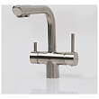 Смеситель с возможностью подключения любого стандартного фильтра для очистки воды. Регулировка подачи очищенной питьевой воды осуществляется с помощью поворота ручки смесителя. Смесители под фильтр подают как обычную водопроводную, так и питьевую воду. С помощью поворота правой ручки смесителя вы регулируете подачу водопроводной воды и ее температуру. При этом поток воды поступает из одного отверстия на изливе смесителя. Чтобы включить подачу очищенной питьевой воды из другого отверстия на изливе смесителя, необходимо повернуть левую ручку изделия. При этом ручка регулирования подачи водопроводной воды должна находиться в закрытом состоянии. Это необходимо для удобного использования питьевой воды. Подача водопроводной и питьевой воды подключаются независимо друг от друга, то есть поток воды может одновременно поступать из двух отверстий смесителя.