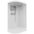 Душевая кабина BMM120R бренда Parly: без центральной панели, средний поддон, прозрачные передние/белые задние стекла, полочка, большое встроенное зеркало.