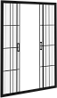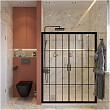 Душевая дверь с матовым черным профилем, прозрачным стеклом, декорированная рисунком на стекле.