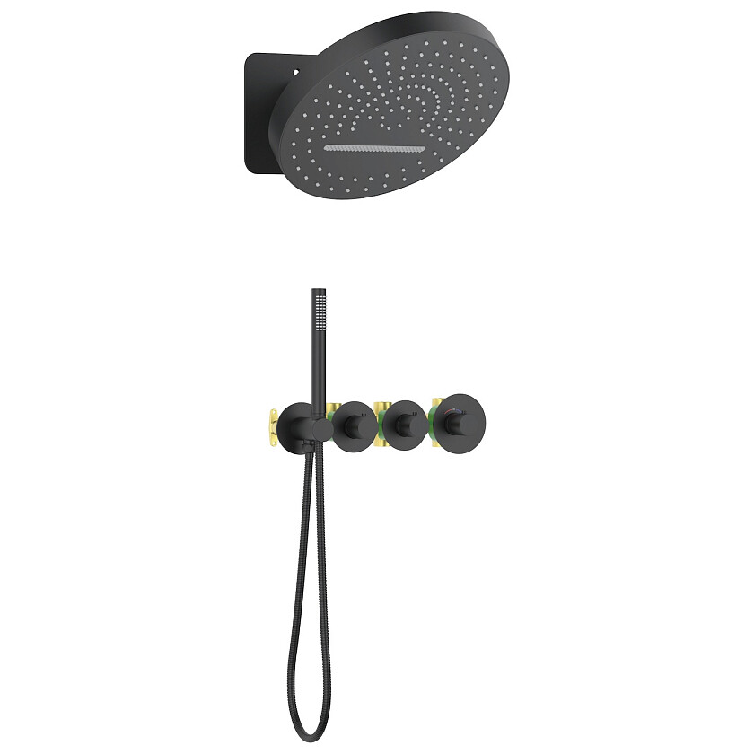 Цвет душевой системы, верхней и ручной лейки: черный матовый.