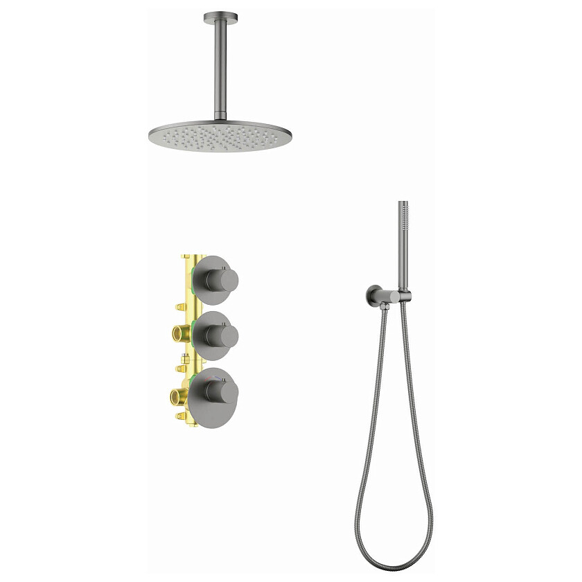 Душевая система скрытого монтажа с термостатом с круглой лейкой (латунь) в стиле модерн.
