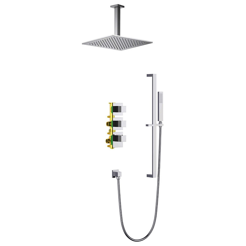 Душевая система скрытого монтажа с термостатом и квадратной лейкой (латунь) в стиле модерн.