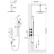 Комплектация: встраиваемый блок управления душевой системой, декоративные накладки - 3 шт., декоративные гильзы - 3 шт., ручки управления режимами (дивертор) - 2 шт., ручка управления термостатом, отвод из стены с подключением шланга душа, шланг душа 1,5 м (латунный), стойка для душа (латунная), ручной душ (латунный), держатель лейки тропического душа (латунный), тропический душ (латунный), инструкция.