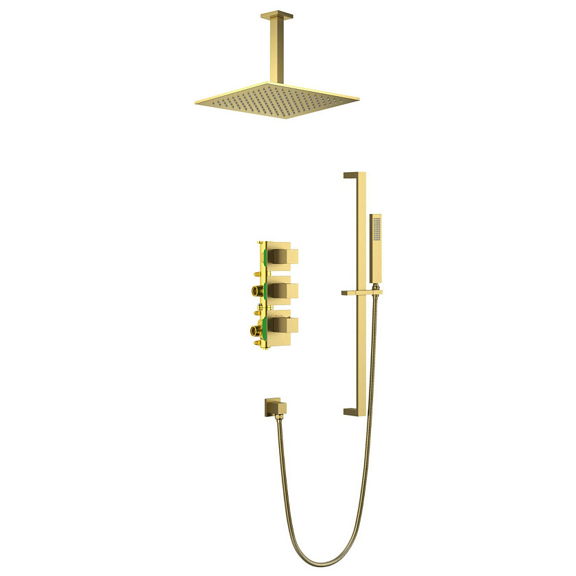 Комплектация: встраиваемый блок управления душевой системой, декоративные накладки - 3 шт., декоративные гильзы - 3 шт., ручки управления режимами (дивертор) - 2 шт., ручка управления термостатом, отвод из стены с подключением шланга душа, шланг душа 1,5 м (латунный), стойка для душа (латунная), ручной душ (латунный), держатель лейки тропического душа (латунный), тропический душ (латунный), инструкция.