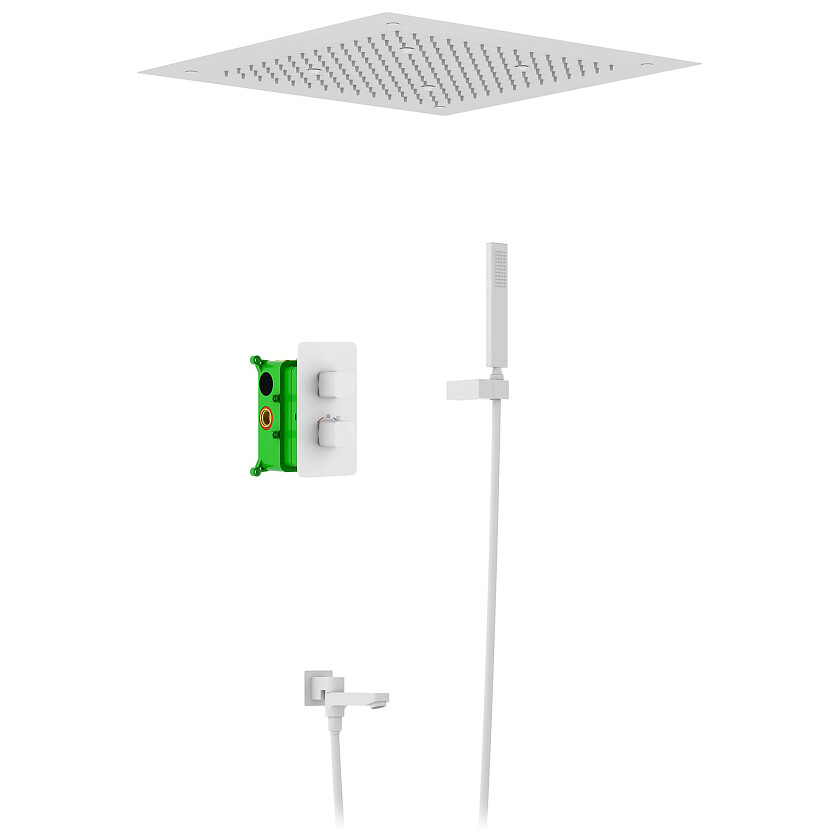 Установить встроенную систему можно в любом месте. Использовать такой смеситель очень удобно, регулировка температуры воды осуществляется ручкой термостата (расположена снизу). Режим "тропический душ" и увеличение напора осуществляется поворотом ручки дивертора (расположена сверху) влево. Для переключения в режим "излив" верните ручку дивертора в исходное положение 12:00 (смеситель выключен), а затем поверните вправо.