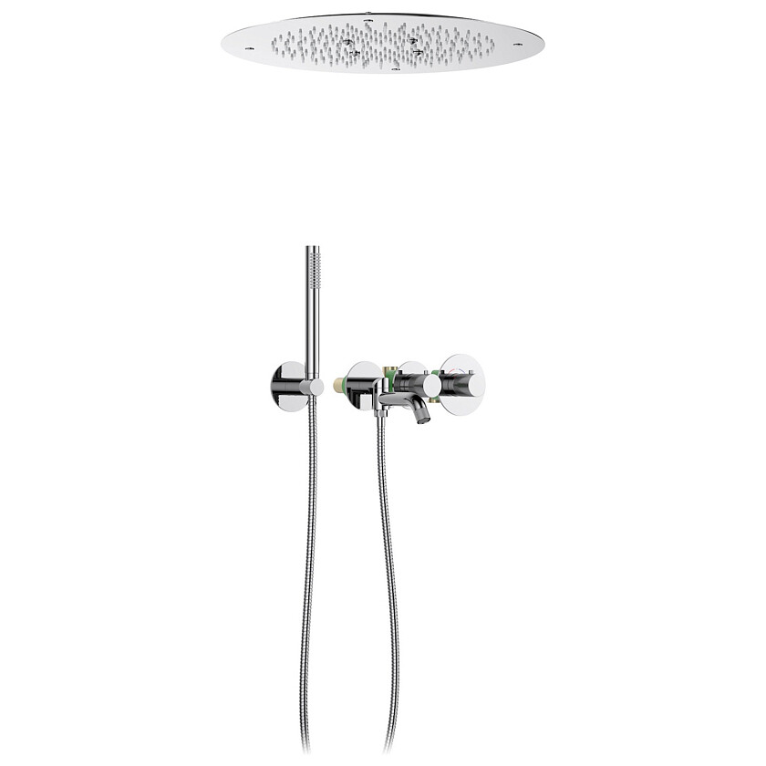 Основные преимущества встроенной системы: элегантный внешний вид, все коммуникации и крепления спрятаны в стену и потолок, снаружи видны только декоративные элементы. Установить встроенную систему можно в любом месте. Переключение режимов подачи воды (тропический душ, излив) осуществляется поворотом керамического дивертора. Для переключения потока воды с излива на ручной душ - поверните излив к стене.