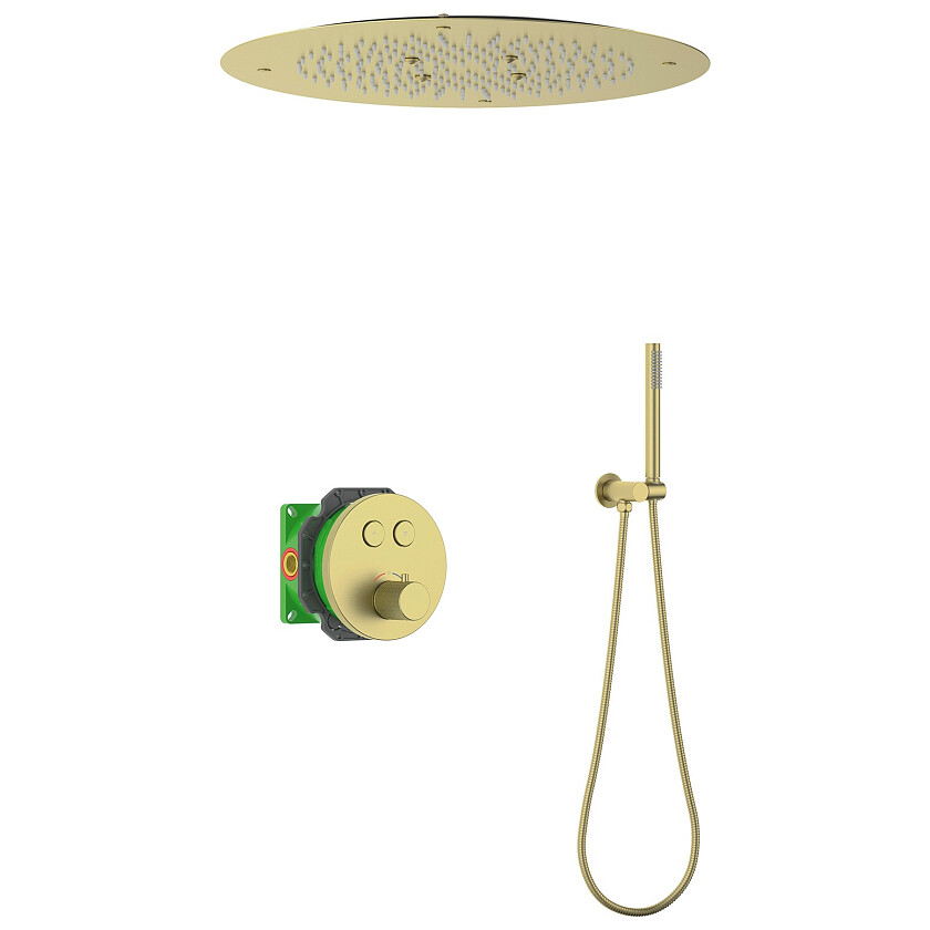 Установить встроенную систему можно в любом месте. Использовать такой смеситель очень удобно, регулировка температуры воды осуществляется ручкой термостата (расположена снизу). Для включения режима «Ручнои душ» нажмите клавишу на панели с соответствующим символом. При повторном нажатии кнопки смеситель прекратит работу. Для включения режима «Тропическии душ» нажмите клавишу с символом «Тропическии душ». При включении режимов «Тропическии душ» и «Ручнои душ» напор воды максимальный и не регулируется.