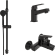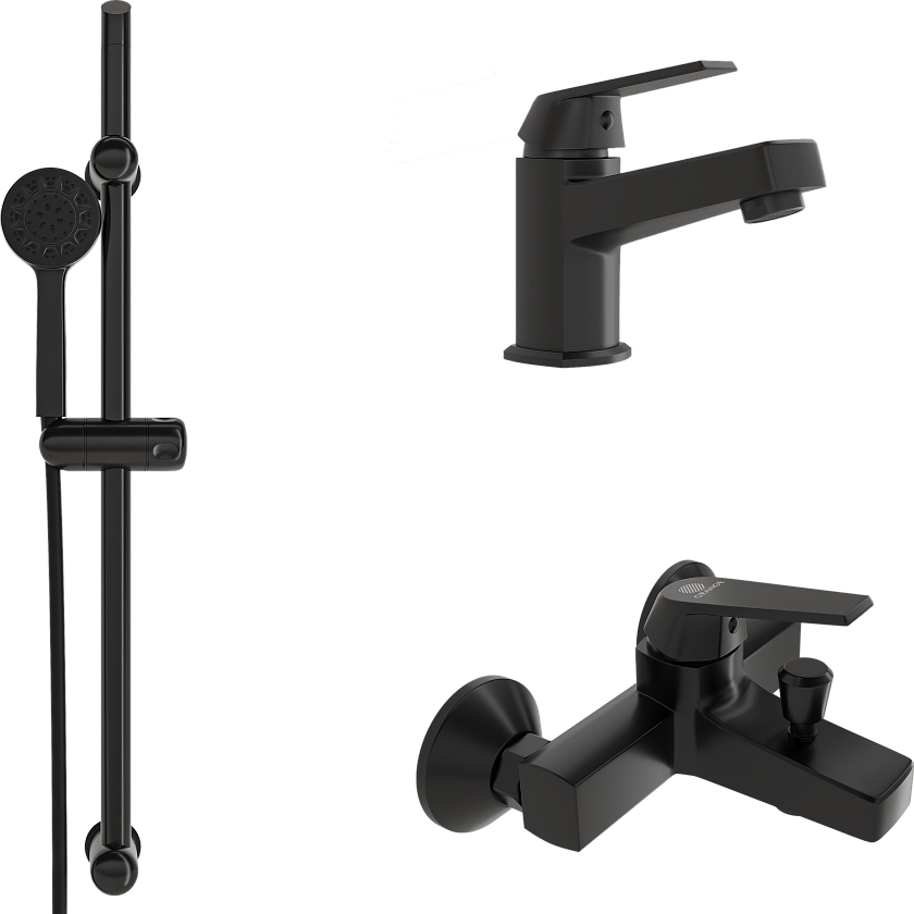 Комплектация: смеситель - 2 шт., комплект подводки, набор креплений, эксцентрик - 2 шт., душевая штанга, лейка, шланг, держатель для душа, инструкция - 3 шт.