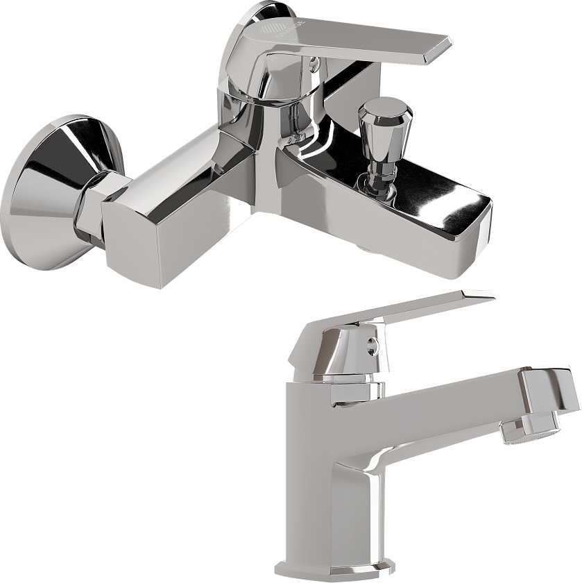 Комплектация: смеситель для раковины. комплект подводки, набор креплений, смеситель для ванны с душем, эксцентрик - 2 шт., инструкция - 2 шт.