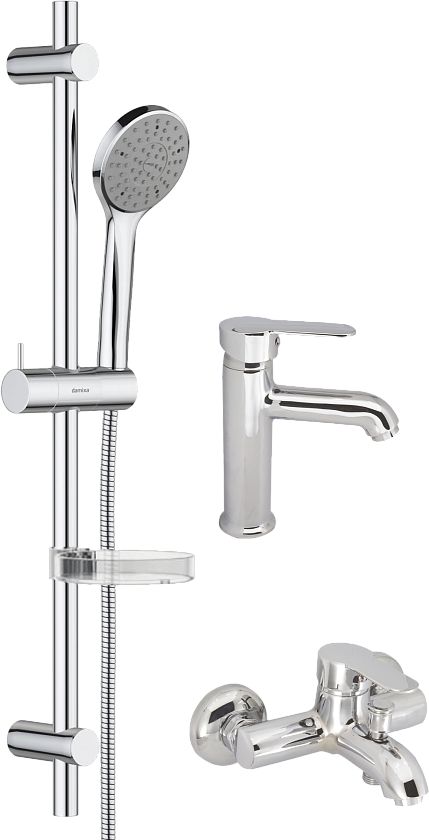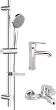 Состав комплекта: душевая штанга, душевой гарнитур, смеситель для раковины, смеситель для ванны с душем