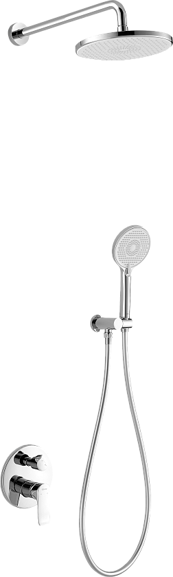 Состав комплекта: настенный держатель, шланговое подключение, верхний душ, душевой гарнитур, переключатель потоков