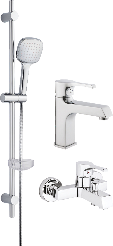 Состав комплекта: душевая штанга, душевой гарнитур, смеситель для раковины, смеситель для ванны с душем