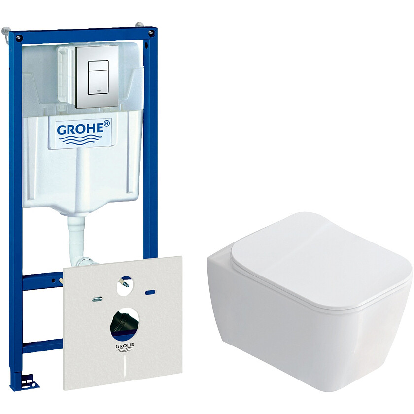 Комплектация: чаша унитаза, крышка-сиденье, система инсталляции, бачок скрытого монтажа, переходник, комплект креплений, кнопка смыва, шумоизоляционная панель, резиновая втулка - 2 шт., инструкция - 3 шт.