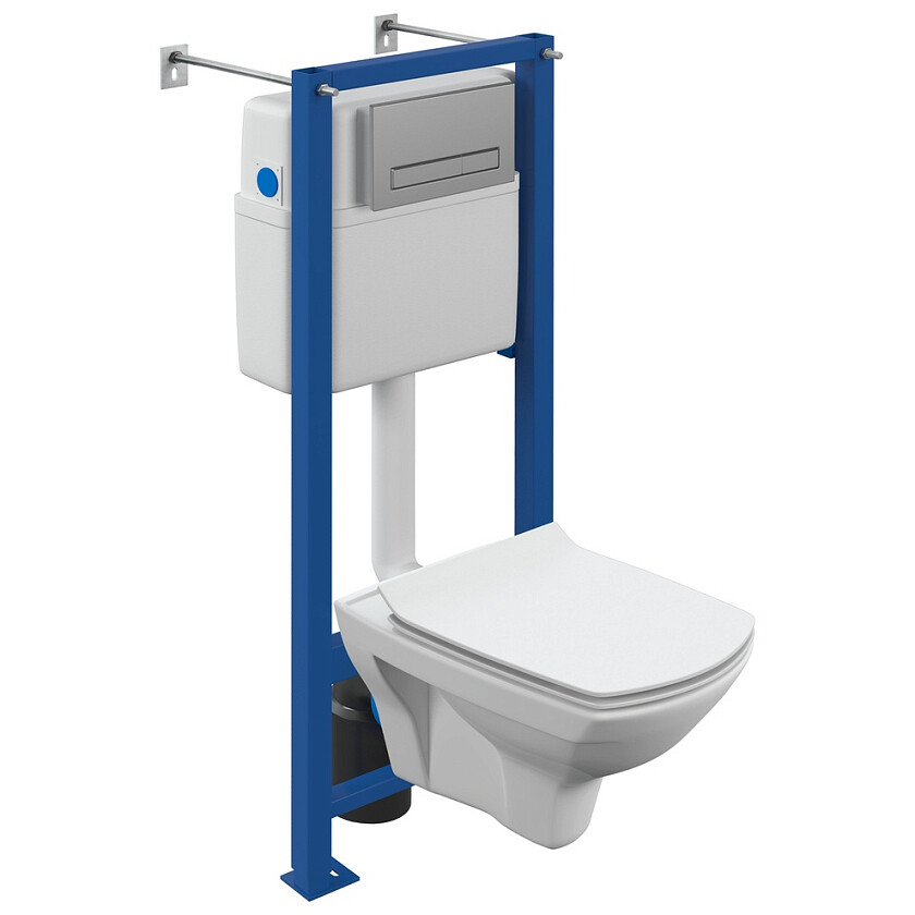 Комплект CARINA XL Clean On с ультратонким антибактериальным сиденьем из дюропласта с функцией плавного закрывания и легкосъемом, с инсталляцией VECTOR и пластиковой кнопкой смыва BLICK, хром матовый.