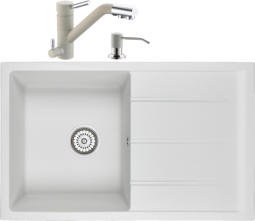Мойка кухонная 80х50 см белая Domaci "Солерно" EMQ-1800.Q со смесителем EC-3008 и дозатором 401 - изображение 1