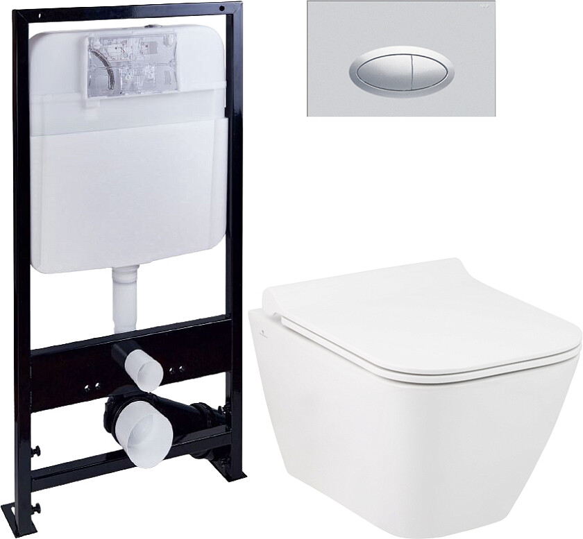 Комплектация: чаша унитаза, крышка-сиденье, система инсталляции, бачок скрытого монтажа, комплект креплений, кнопка смыва, инструкция - 4 шт.