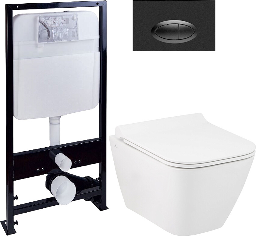 Комплектация: чаша унитаза, крышка-сиденье, система инсталляции, бачок скрытого монтажа, комплект креплений, кнопка смыва, инструкция - 4 шт.