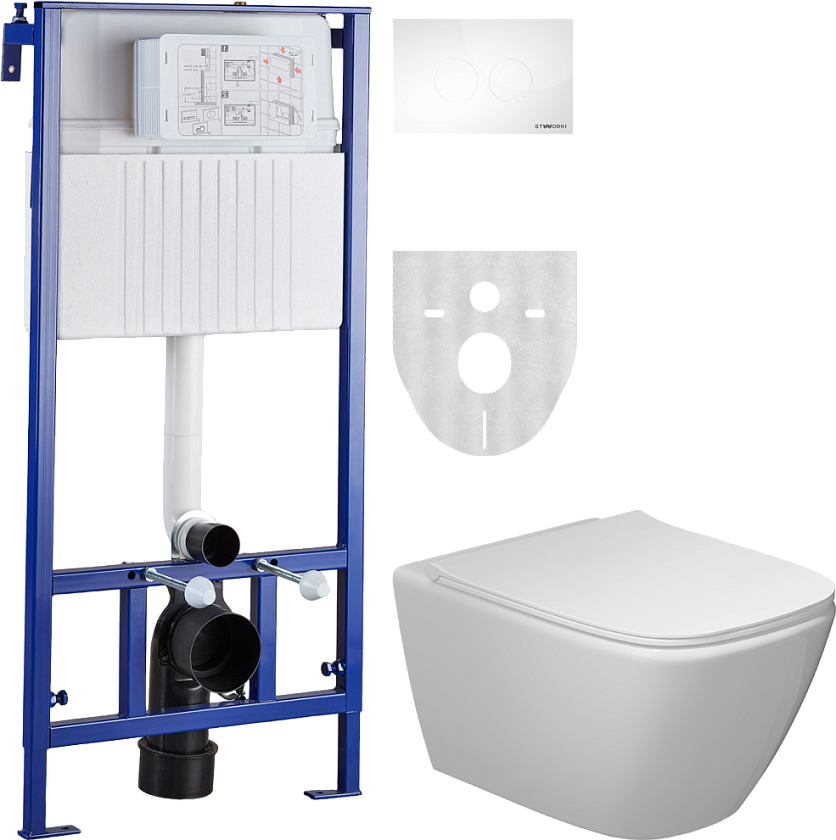 Комплектация: чаша унитаза, крышка-сиденье, система инсталляции, бачок скрытого монтажа, комплект креплений, панель шумоизоляционная, кнопка смыва, инструкция - 3 шт.