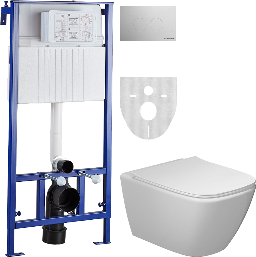 Комплектация: чаша унитаза, крышка-сиденье, система инсталляции, бачок скрытого монтажа, комплект креплений, панель шумоизоляционная, кнопка смыва, инструкция - 3 шт.