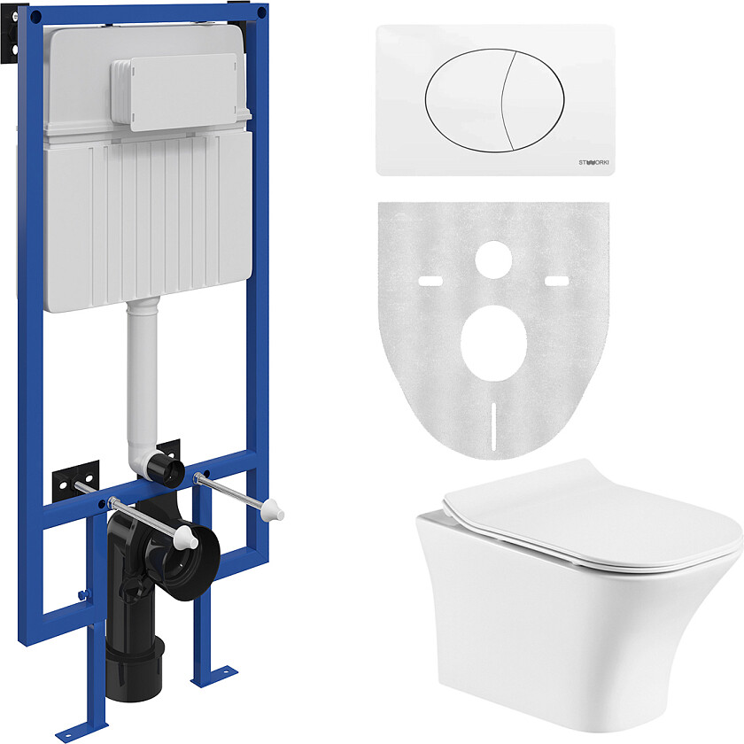 Комплектация: чаша унитаза, крышка-сиденье, система инсталляции, бачок скрытого монтажа, комплект креплений, панель шумоизоляционная, кнопка смыва, инструкция - 3 шт.
