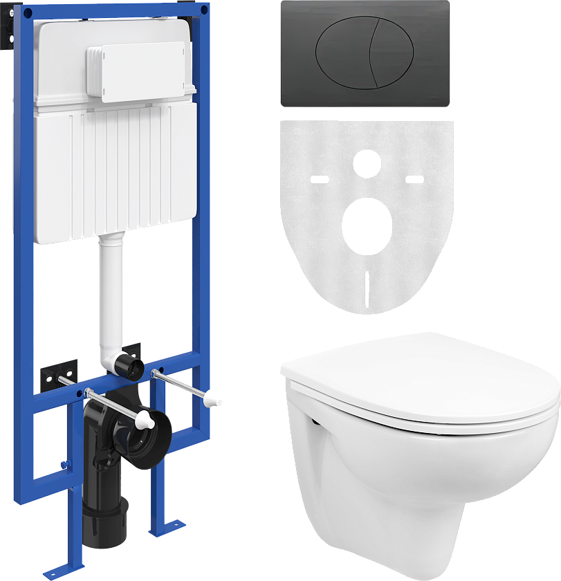 В комплекте: чаша унитаза - 1 шт., крышка-сиденье - 1 шт., система инсталляции - 1 шт., бачок скрытого монтажа - 1 шт., панель шумоизоляционная - 1 шт., кнопка смыва - 1 шт., инструкция - 3 шт.