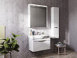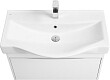 Широкий бортик под смеситель не дает воде затекать за раковину и предупреждает образование плесени и грибка. Передний край раковины выступает аккуратным полукругом за фасад тумбы и придает гарнитуру современный вид.