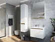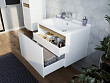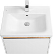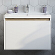 Раковина монтируется на тумбу и аккуратным полукругом выступает за границы фасада. Готовый комплект смотрится интересно, не перегружая пространство.