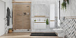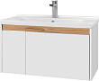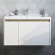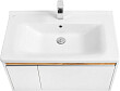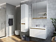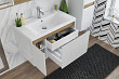Раковина монтируется на тумбу и аккуратным полукругом выступает за границы фасада. Готовый комплект смотрится интересно, не перегружая пространство.