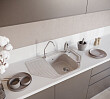 Угловую кухню поможет обустроить мойка Domaci «Бьелла». Изготовлена из искусственного мрамора – материала, который в 8 раз прочнее натурального камня. Комфорт при мытье посуды обеспечивает вместительная чаша с шероховатым дном и гладкими стенками. Поверхность с покрытием гелькоут гигиенична, обладает антибактериальным эффектом и легко чистится мягкой губкой, смоченной в мыльном растворе.