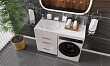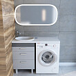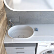В целях экономии полезного пространства можно установить раковину над стиральной машиной. Раковина красиво совмещается с бытовой техникой, и выглядит так, как будто входит в ее конструкцию.
