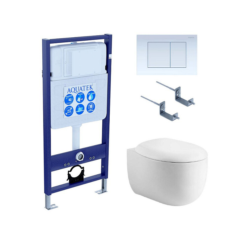 Комплект унитаза с инсталляцией Set Aquatek Альтаир, сиденьем Микролифт, звукоизоляционной прокладкой, крепежом и клавишей смыва.