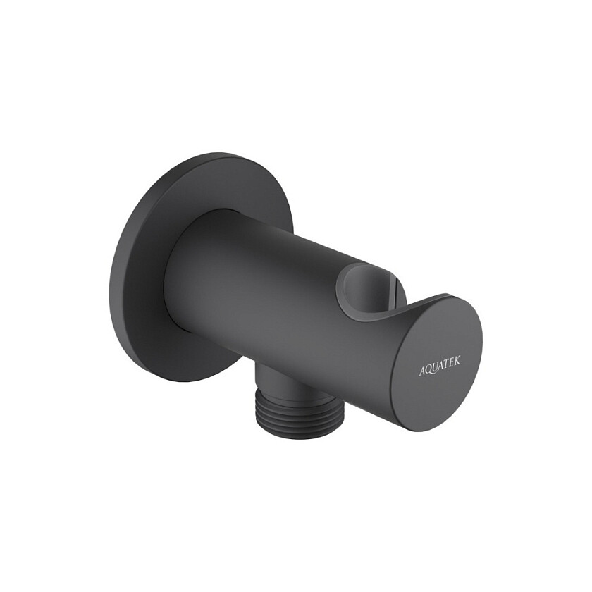 Шланговое подсоединение AQUATEK, с держателем, матовый черный AQ2464MB. Предназначен для комплектации встраиваемых смесителей. Обеспечивает качественное соединение душевого шланга и трубопровода.