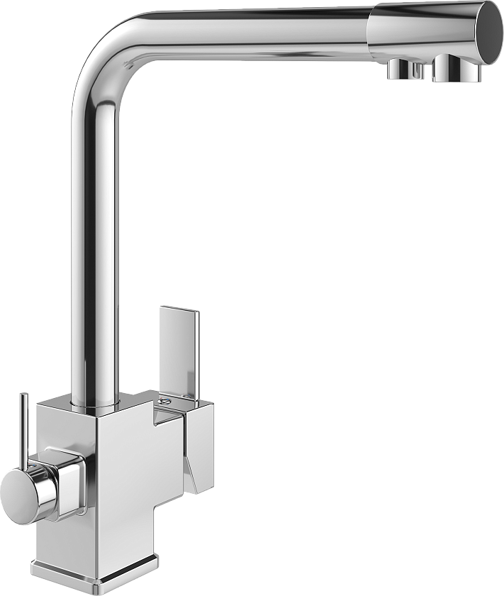 Изюминка модели — встроенный кран фильтра. Для подачи питьевой воды смеситель оснащен дополнительным изливом и отдельным рычагом управления.