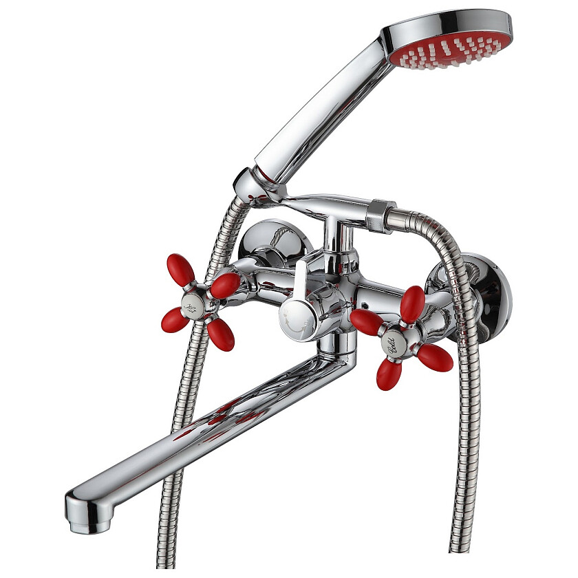 Смеситель для ванны двухвентильный с душевым гарнитуром хром, красный Ammore A4683-4