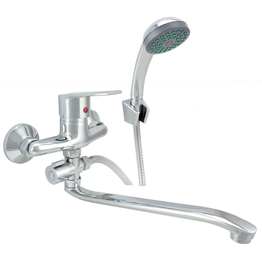 Преимущества: товар первой цены в категории смесители с длинным изливом для ванной комнаты; высокая прочность корпуса, которая достигается за счет его толщины; надежный дивертор: флажковый (керамический).
