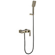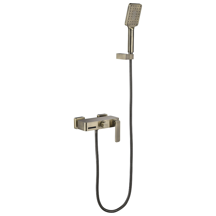 Корпус смесителя выполнен в виде широкой полки, которую можно использовать для размещения средств для душа.