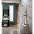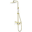 Верхний душ имеет функцию тропический душ. Лейка 3-функциональная, крепление регулируется по высоте. Шланг в цвете золото длиной 1.5 м.