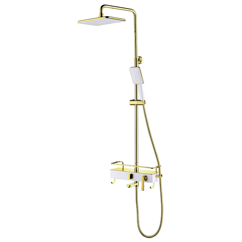 Душевая система Lemark Mista изготовлена из латуни в оригинальном дизайном с контрастными деталями в белом и золотом цветах. Смеситель имеет удобную прямоугольную полочку для душевых принадлежностей.