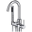 Основные преимущества: все коммуникации, крепления спрятаны в полу, видны только декоративные элементы. Установить смеситель можно в любом месте. Статичная конструкция не требует ремонта ввиду отсутствия подвижного механизма. Смеситель управляется джойстиком, плавно регулирующим температуру воды и напор. Переключение режимов излив / ручная лейка осуществляется дивертором расположенном на корпусе смесителя.