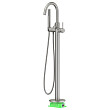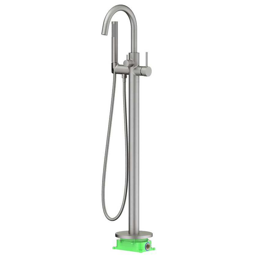 Основные преимущества: все коммуникации, крепления спрятаны в полу, видны только декоративные элементы. Установить смеситель можно в любом месте. Статичная конструкция не требует ремонта ввиду отсутствия подвижного механизма. Смеситель управляется джойстиком, плавно регулирующим температуру воды и напор. Переключение режимов излив / ручная лейка осуществляется дивертором расположенном на корпусе смесителя.