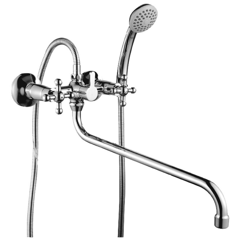 Особый колорит ванной комнате придаст утонченный смеситель Rossinka G G02-84. Крестовые рукоятки, круглый излив и расположенный на корпусе держатель для лейки отсылают к эстетике ретростиля.