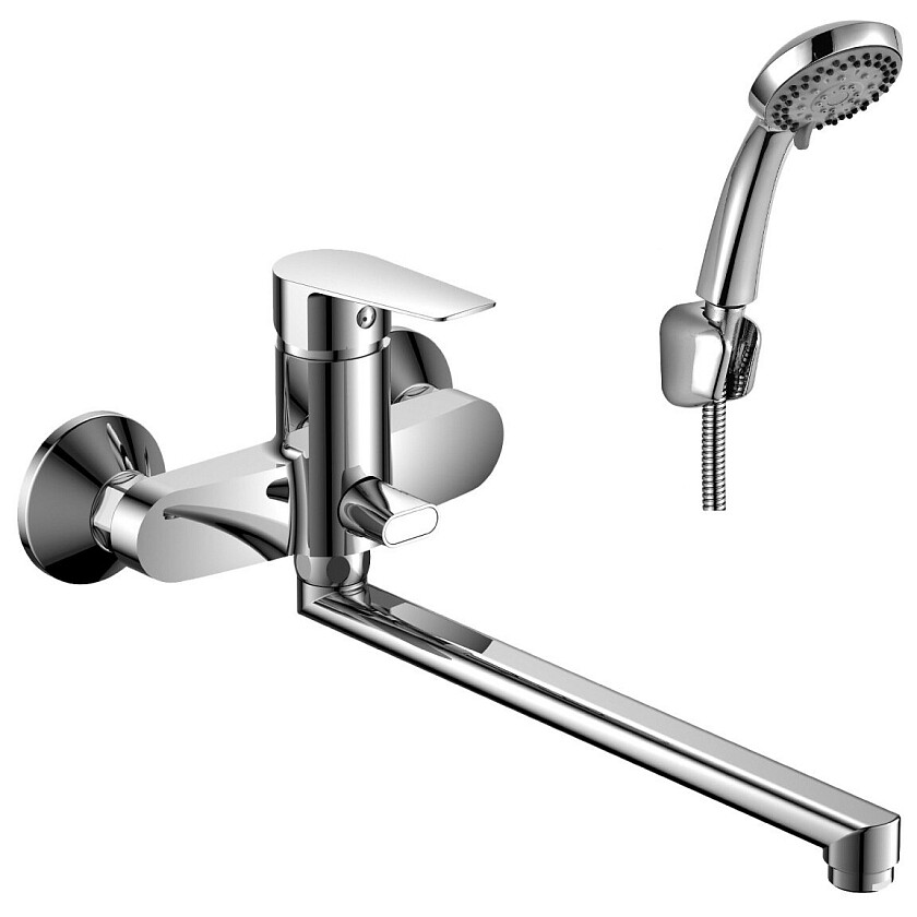 Рукоятка из прочного металла движется плавно, обеспечивая точный выбор температурного режима. Душевой набор включает в себя 5-функциональную лейку с системой самоочистки, полутораметровый шланг и настенное крепление.