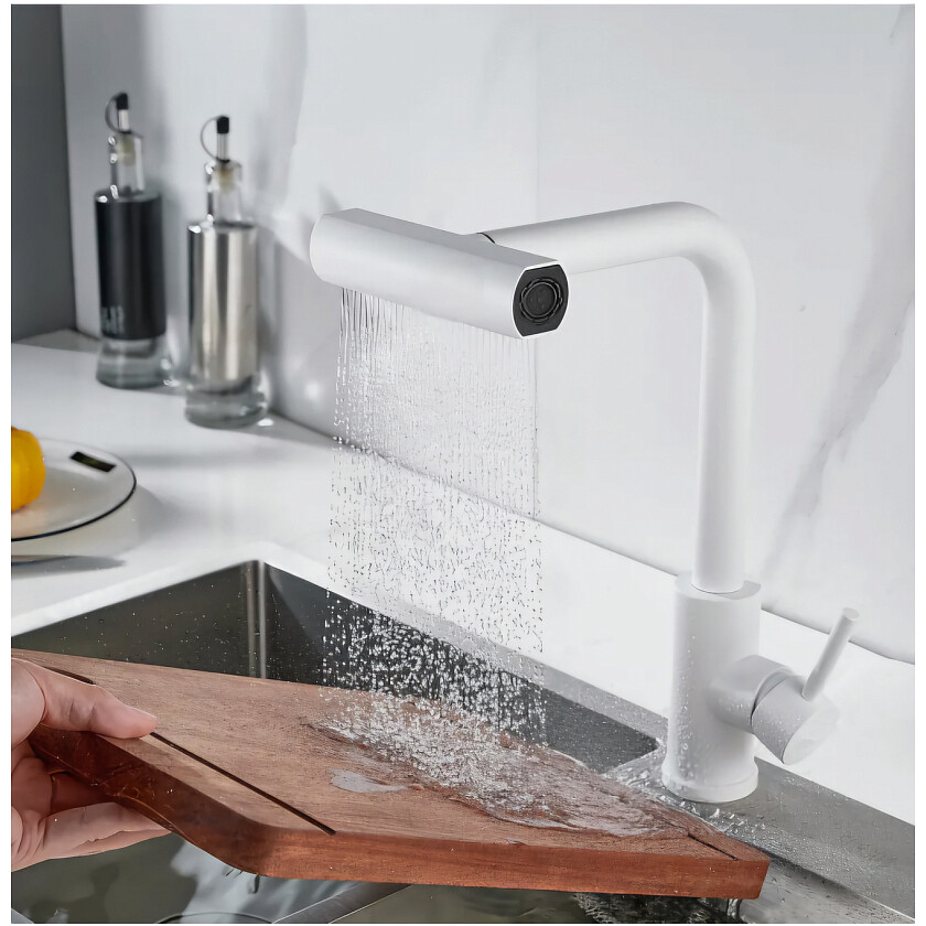 Лейка имеет 4 режима: режим-1 "стандарт" (через аэратор), режим-2 "лезвие" (плоская струя с усиленным напором), режим-3 "ливень" (принцип душевой лейки); режим-4 "каскадный водопад"