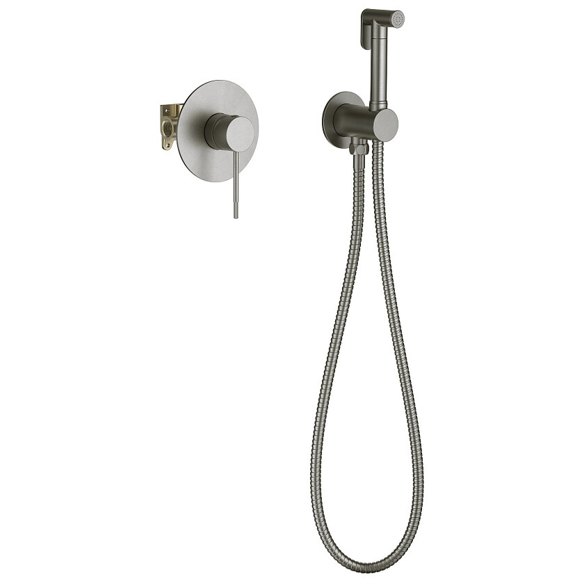 Все коммуникации, крепления и механизмы спрятаны в стену и закрыты декоративной накладкой, снаружи находится только рычаг управления смесителем и держатель гигиенической лейки с подключением шланга, такая модель отлично сочетается с инсталляцией для унитаза. Длины шланга 1,2 метра хватает для решения гигиенических задач. Можно также использовать например, для мытья собаки после прогулки или наполнения ведра воды и т.д.