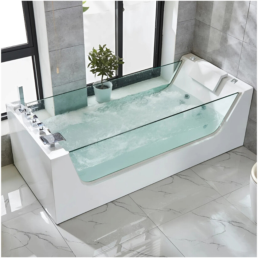 Ударопрочное стекло толщиной 12 мм без металлической окантовки безопасно и придает ванне современный дизайн.удобна и безопасна.